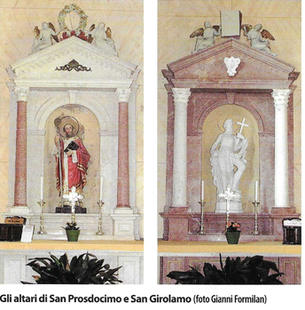 Entrambi gli altari hanno il frontone sormontato da due angeli. Nell'altare di San Prosdocimo, i cherubini sostengono una ghirlanda, simbolo onorifico. Il timpano ha rappresentati in rilievo una mitria, simbolo episcopale.
